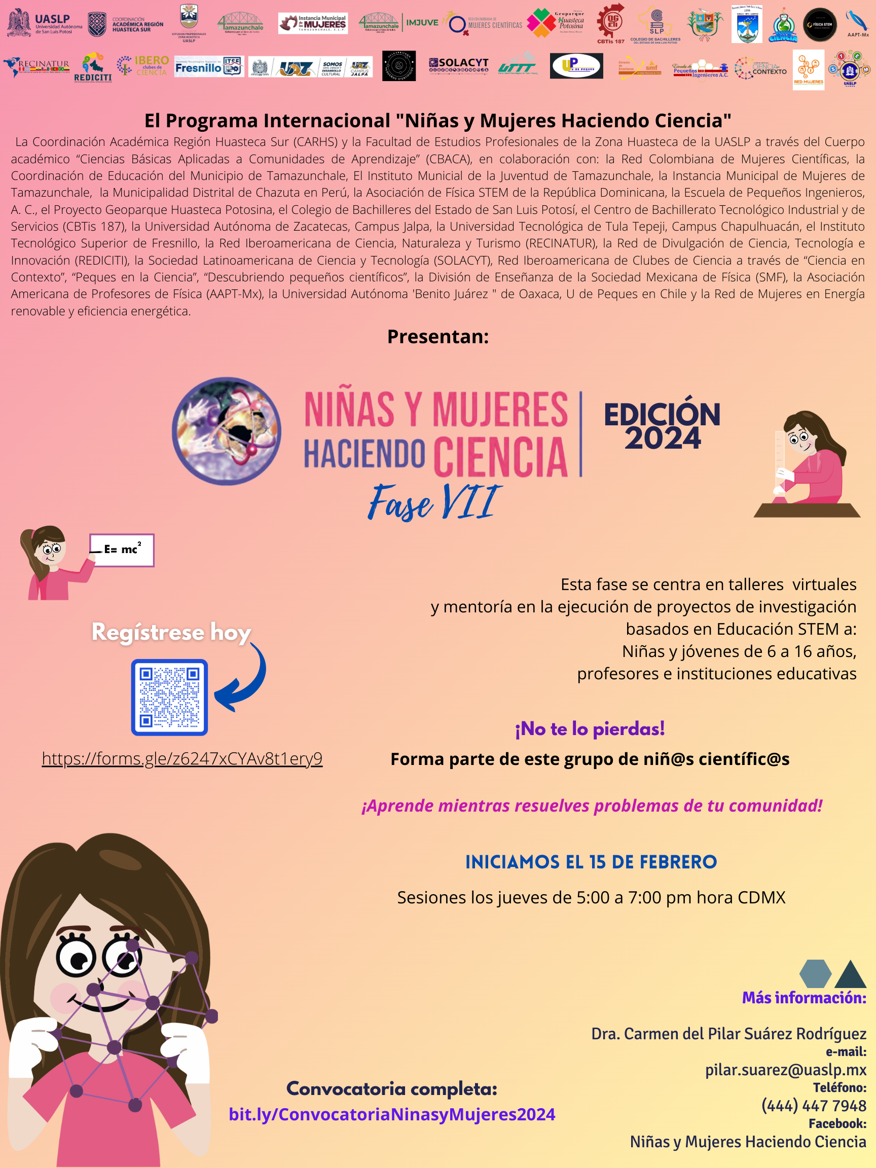 La Coordinación Académica Región Huasteca Sur (CARHS) y la Facultad de Estudios Profesionales de la Zona Huasteca de la UASLP a través del Cuerpo académico «Ciencias Básicas Aplicadas a Comunidades de Aprendizaje» (CBACA), en colaboración con: la Red Colombiana de Mujeres Científicas, la Coordinación de Educación del Municipio de Tamazunchale, El Instituto Municial de la Juventud de Tamazunchale, la Instancia Municipal de Mujeres de Tamazunchale, la Municipalidad Distrital de Chazuta en Perú, la Asociación de Física STEM de la República Dominicana, la Escuela de Pequeños Ingenieros, A C, el Proyecto Geoparque Huasteca Potosina, el Colegio de Bachilleres del Estado de San Luis Potosí, el Centro de Bachillerato Tecnológico Industrial y de Servicios (CBTIs 187), la Universidad Autónoma de Zacatecas, Campus Jalpa, la Universidad Tecnológica de Tula Tepeji, Campus Chapulhuacán, el Instituto Tecnológico Superior de Fresnillo, la Red Iberoamericana de Ciencia, Naturaleza y Turismo (RECINATUR), la Red de Divulgación de Ciencia, Tecnología e Innovación (REDICITI), la Sociedad Latinoamericana de Ciencia y Tecnología (SOLACYT), Red Iberoamericana de Clubes de Ciencia a través de «Ciencia en Contexto», «Peques en la Ciencia», «Descubriendo pequeños científicos», la División de Enseñanza de la Sociedad Mexicana de Física (SMF), la Asociación Americana de Profesores de Fisica (AAPT-Mx), la Universidad Autónoma ‘Benito Juárez» de Oaxaca, U de Peques en Chile y la Red de Mujeres en Energía renovable y eficiencia energética.